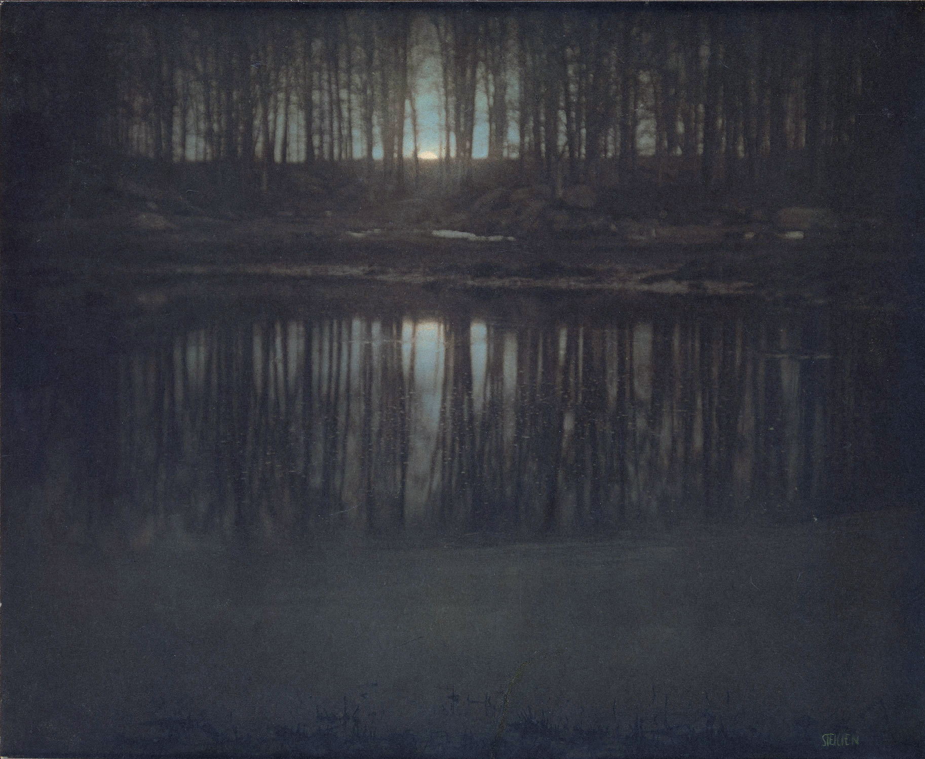 スタイケンはここで、写真が持つ現実性を完全に消してはいません。現実にある池を前提にしながら、その見えを詩的な像へ変えています。この半分だけ現実から離れる感じが、とても魅力的です。
